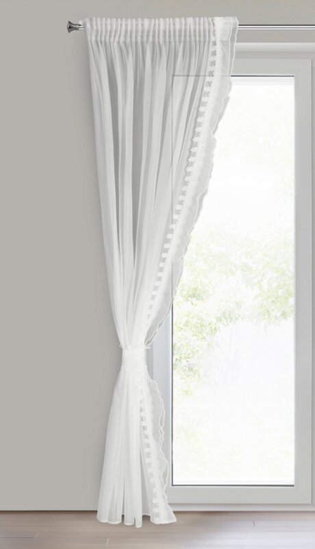 Firana jest gotowa do powieszenia na taśmie marszczącej, co umożliwia łatwy montaż na karniszu. W komplecie znajduje się troczek, który pozwala na eleganckie upięcie materiału.