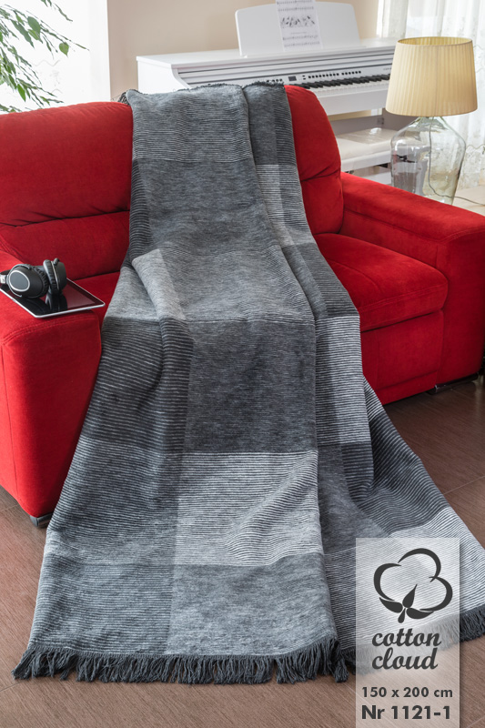 Koc bawełniany akrylowy, Rozmiar: 150×200 cm, Tolerancja rozmiaru: +/-3%, Materiał: 60% bawełna, 40% akryl, Gramatura: 430 g/m2, Wykończenie koca: frędzle, Pakowanie: przezroczysty woreczek z suwakiem, Koc dwustronny