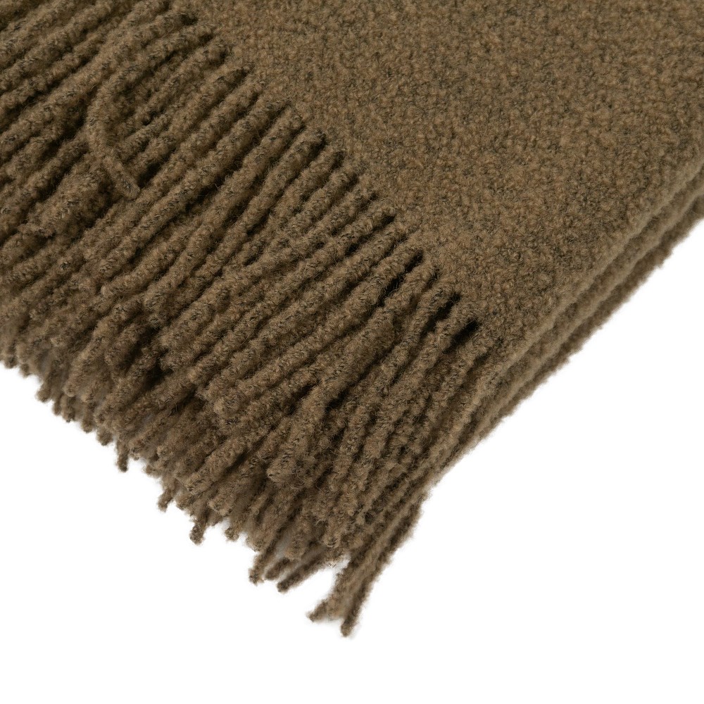 Brązowy kolor w odcieniu ziemi w połączeniu z ozdobnymi frędzlami nadaje kocowi ponadczasowego charakteru. Struktura bukle to subtelna, lekko pętelkowa faktura, która dodaje mu elegancji i nowoczesności.