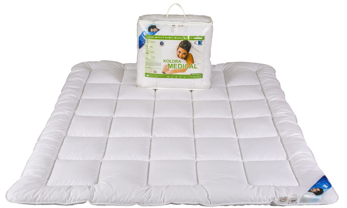 Kołdra antyalergiczna 150×200 Medical AMW, Skład tkaniny: 52% poliester, 48% bawełna, Wypełnienie kołder: 100% poliester silikonowany Hollow, Gramatura wypełnienia: 1150g, Tkanina posiada certyfikat OEKO-TEX STANDARD 100.