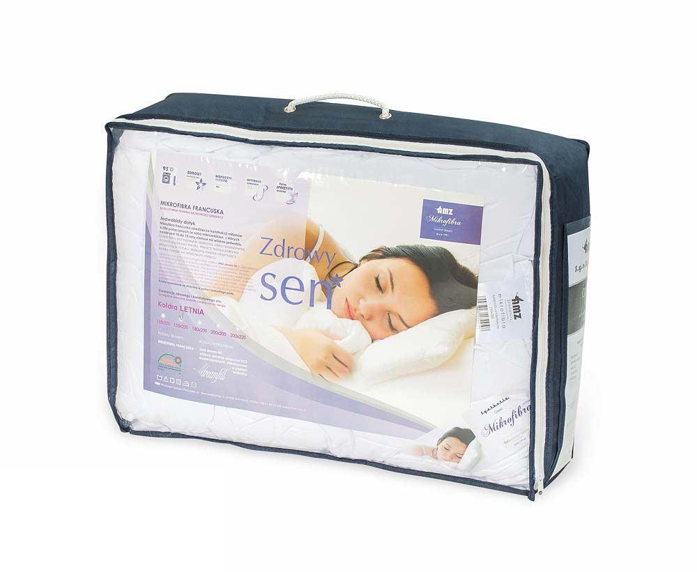 Kołdra Mikrofibra, Kolekcja: Zdrowy Sen, Rozmiar: 155×200, Sezonowość: letnia, ze względu na wyjątkową lekkość, Kolor: biały, Tkanina: mikrofibra francuska, 100% poliester, Wypełnienie kołdry: AMZ dream-fill, włókno poliestrowe spiralnie skręcone HCS (Hollow Conjugate Siliconized), wysokosprężyste, silikonowane – w postaci włókniny, Waga wypełnienia: 300g, Produkt posiada certyfikat „TEKSTYLIA GODNE ZAUFANIA zbadane na substancje szkodliwe według OEKO-TEX® Standard 100”.Opakowanie: folia z przodu i materiał o granatowym kolorze z tyłu i z boków