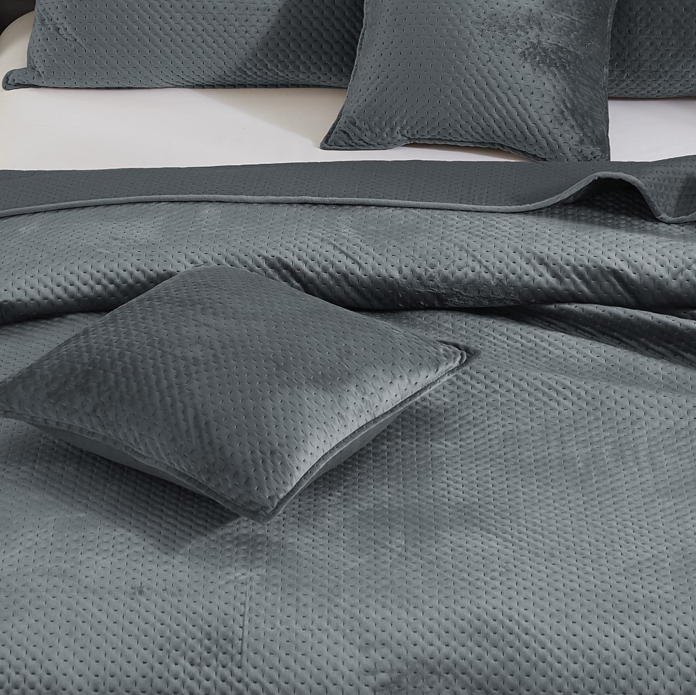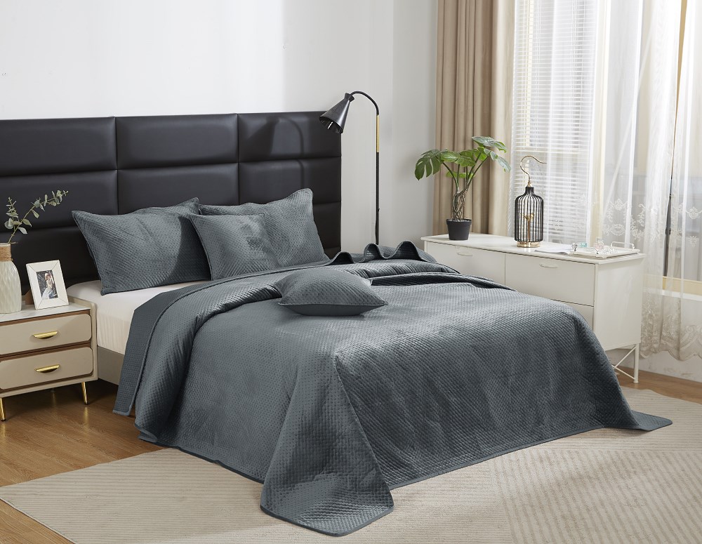 Grafitowy kolor w połączeniu z geometrycznym wzorem krzyżyków tworzy ponadczasową aranżację, która pasuje zarówno do nowoczesnych, jak i klasycznych wnętrz. Narzuta nie tylko chroni meble, ale także staje się stylową dekoracją.