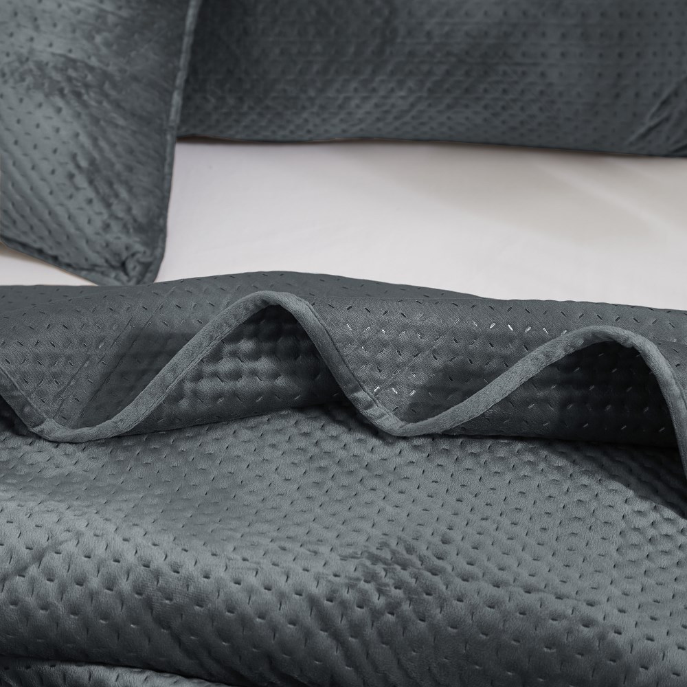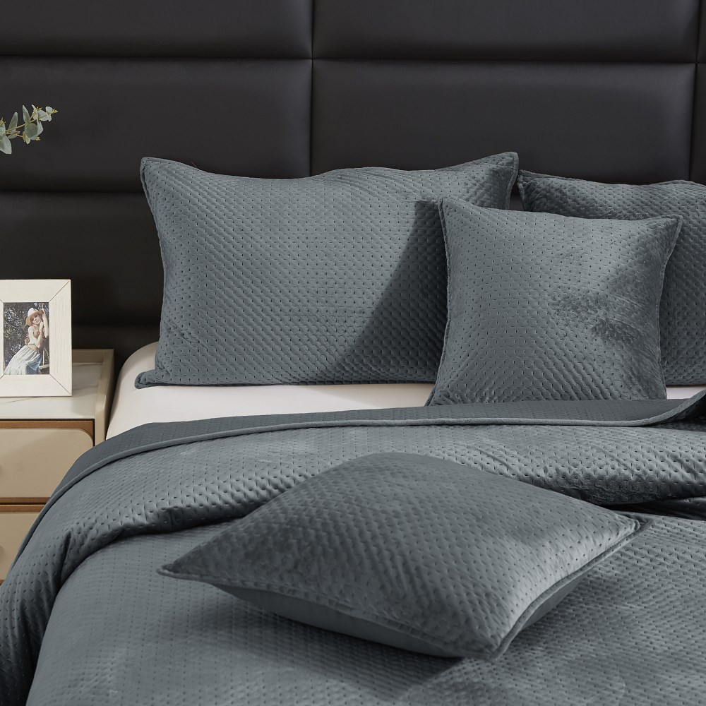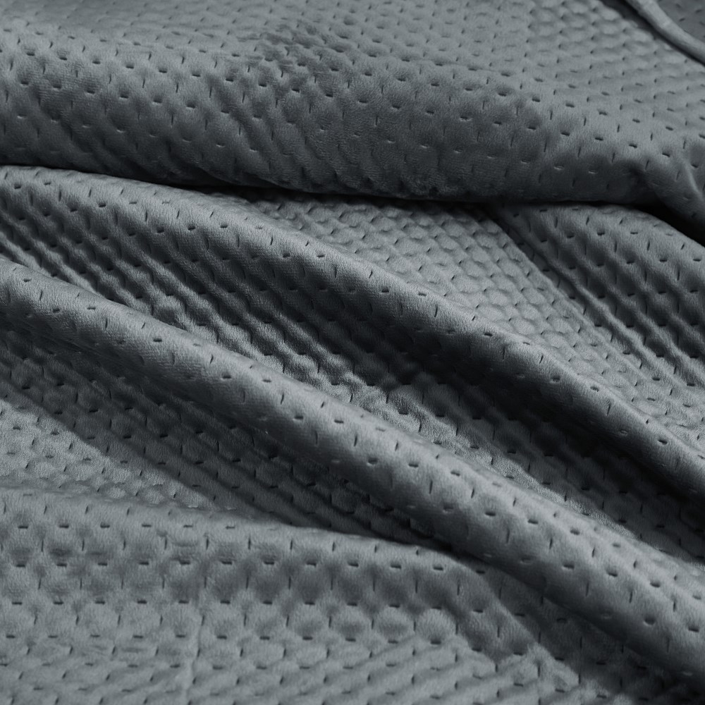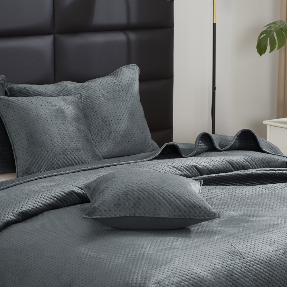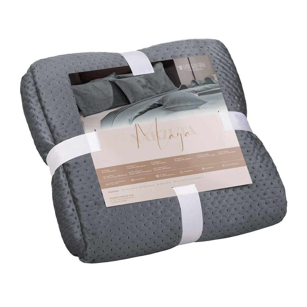 Narzuta welurowa Maya to doskonały wybór dla osób ceniących elegancję i funkcjonalność. Dzięki subtelnemu, grafitowemu kolorowi oraz geometrycznemu wzorowi, wkomponuje się w każde wnętrze, nadając mu nowoczesny charakter.