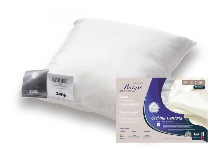 Linia batyst, Rodzaje poduszek: gładkie, Rozmiary poduszek: 40×40, Dostępne kolory: biały, Tkanina: delikatna 100% bawełna, Waga: 250g, Wypełnienie poduszek: włókno ADVANSA – 4-kanalikowe, wysokosprężyste, silikonowane, spiralnie skręcone. Certyfikaty: Oko-Tex