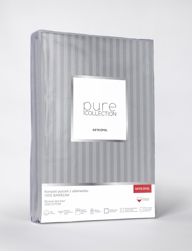 Pościel adamaszkowa, W skład kompletu pościeli adamaszkowej wchodzą: – poszwa na kołdrę w rozmiarze 180×200 cm – 1 szt. – poszewka na poduszkę w rozmiarze 70×80 cm – 2 szt. Komplet składa się z 3 części. Tolerancja rozmiaru 3%, Gramatura: 120 g/m2, Materiał: 100% bawełna o gęstym splocie adamaszkowym, Deseń: pasy o szerokości 1cm, Poszwa i poszewki zapinane na suwak. Tkanina użyta do produkcji posiada certyfikat Tekstylia Godne Zaufania zbadane na substancje szkodliwe według OEKO-TEX® Standard 100.