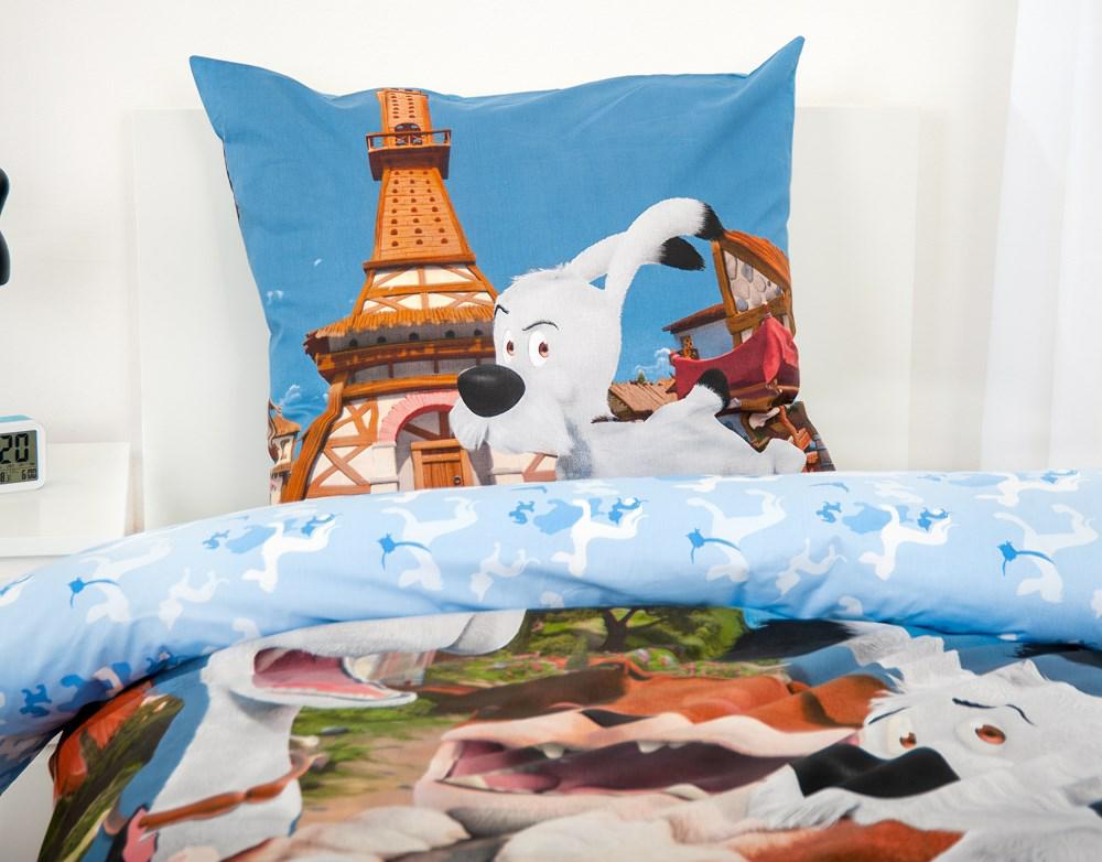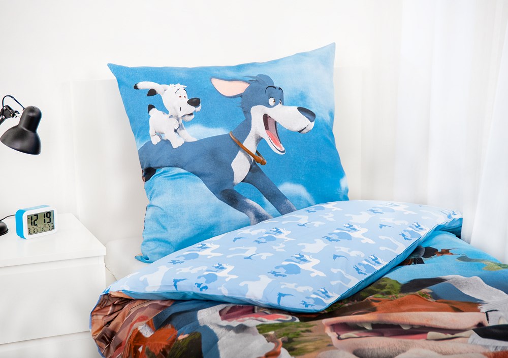 Kolorowa grafika z postaciami Idefiksa i Niezłomnych w odcieniach niebieskiego ożywia wnętrze i pobudza dziecięcą wyobraźnię. Wzór inspirowany światem Galów sprawia, że zasypianie staje się prawdziwą przygodą.