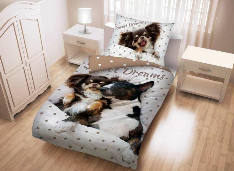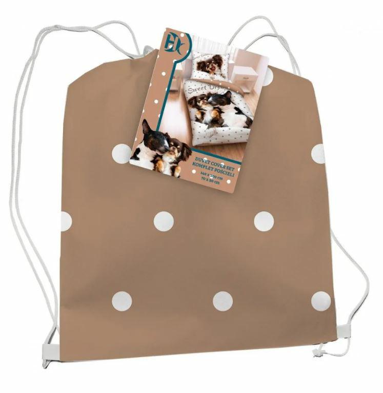 Pościel bawełniana 140×200 Pieski beżowa poszewka 70×90 + worek bawełniany Halantex