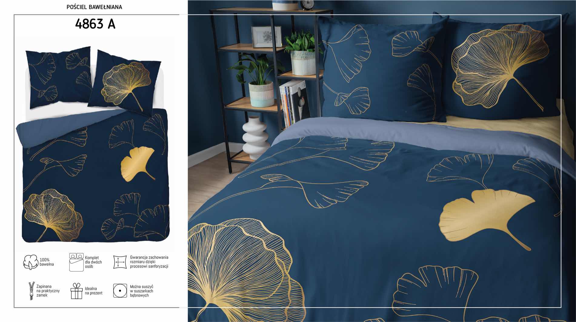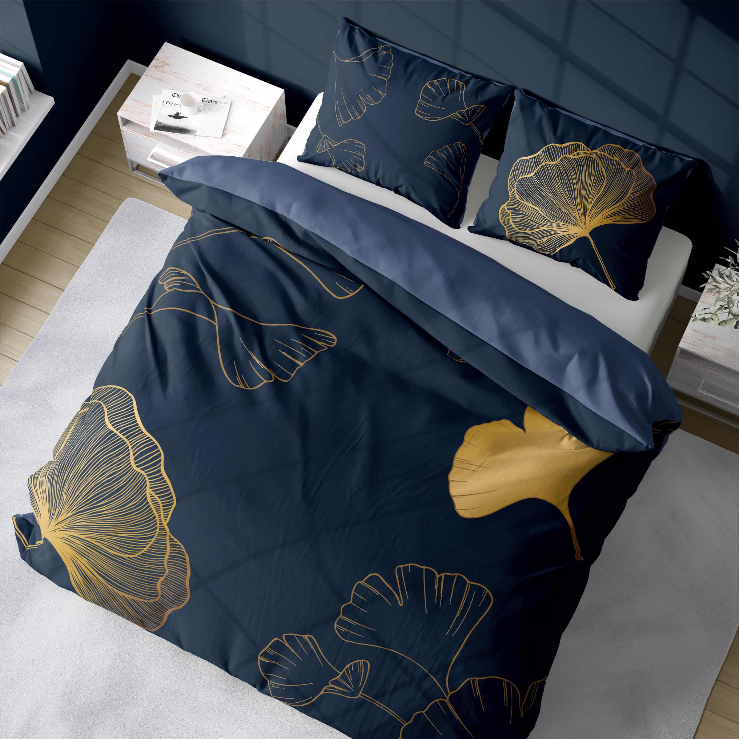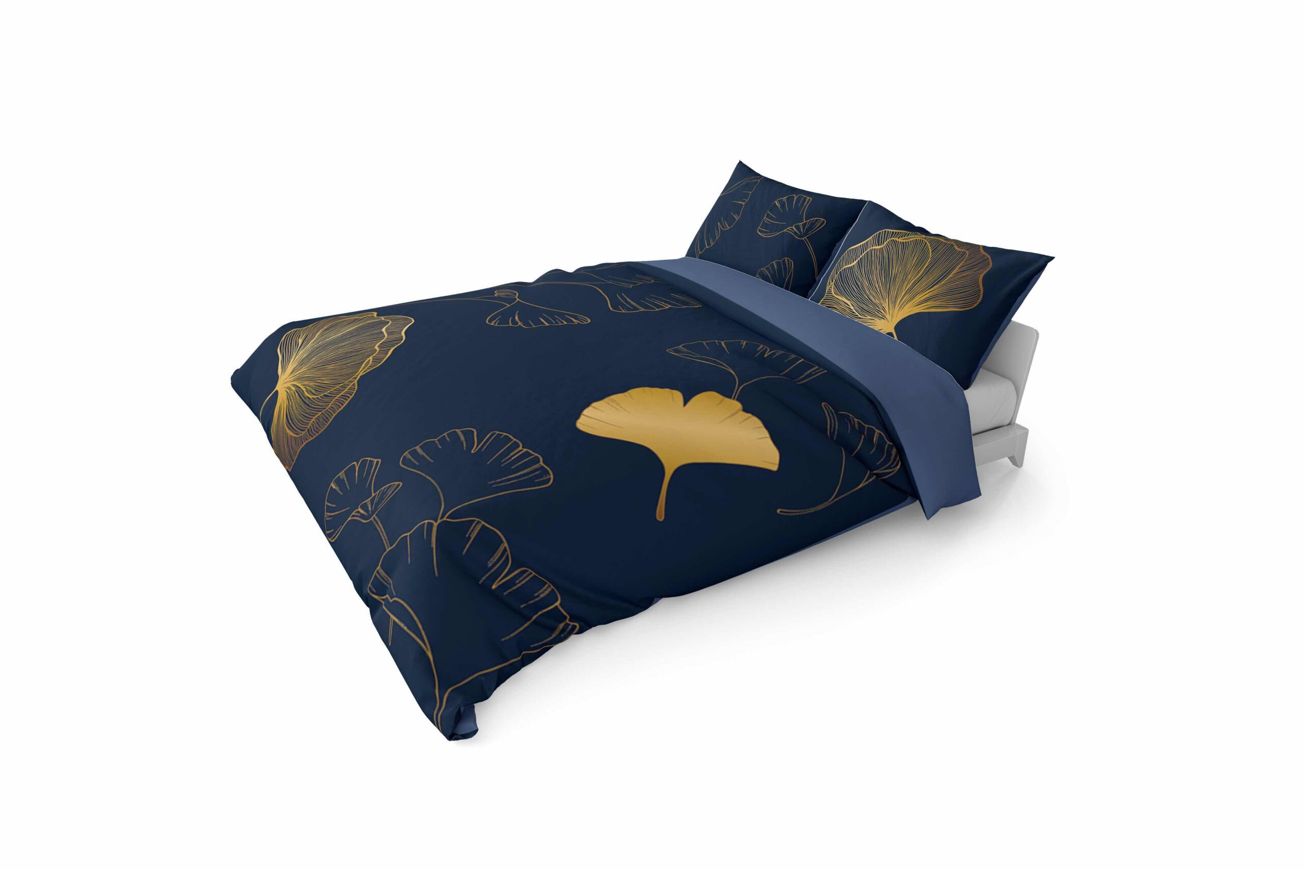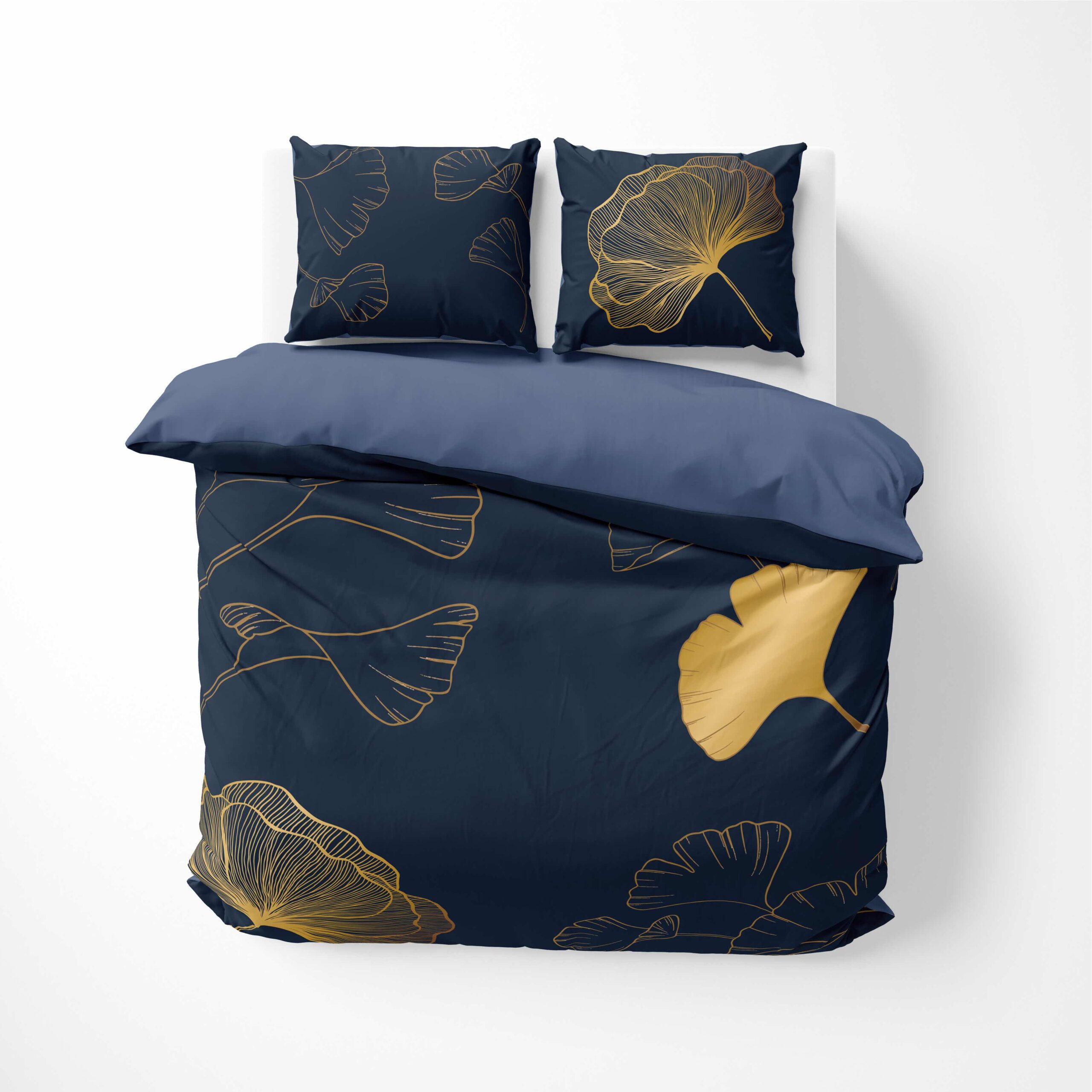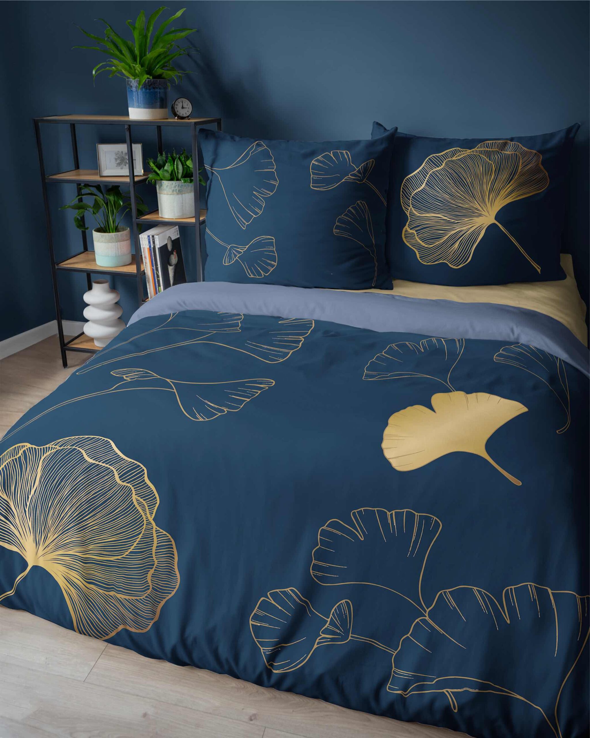 Zachwyć się wyjątkowym wzorem inspirowanym naturą – złote liście miłorzębu na głębokim, granatowym tle to propozycja dla osób ceniących wyrafinowany styl i nowoczesną estetykę. Ta pościel stanie się ozdobą każdej sypialni, wprowadzając do niej atmosferę luksusu i spokoju.