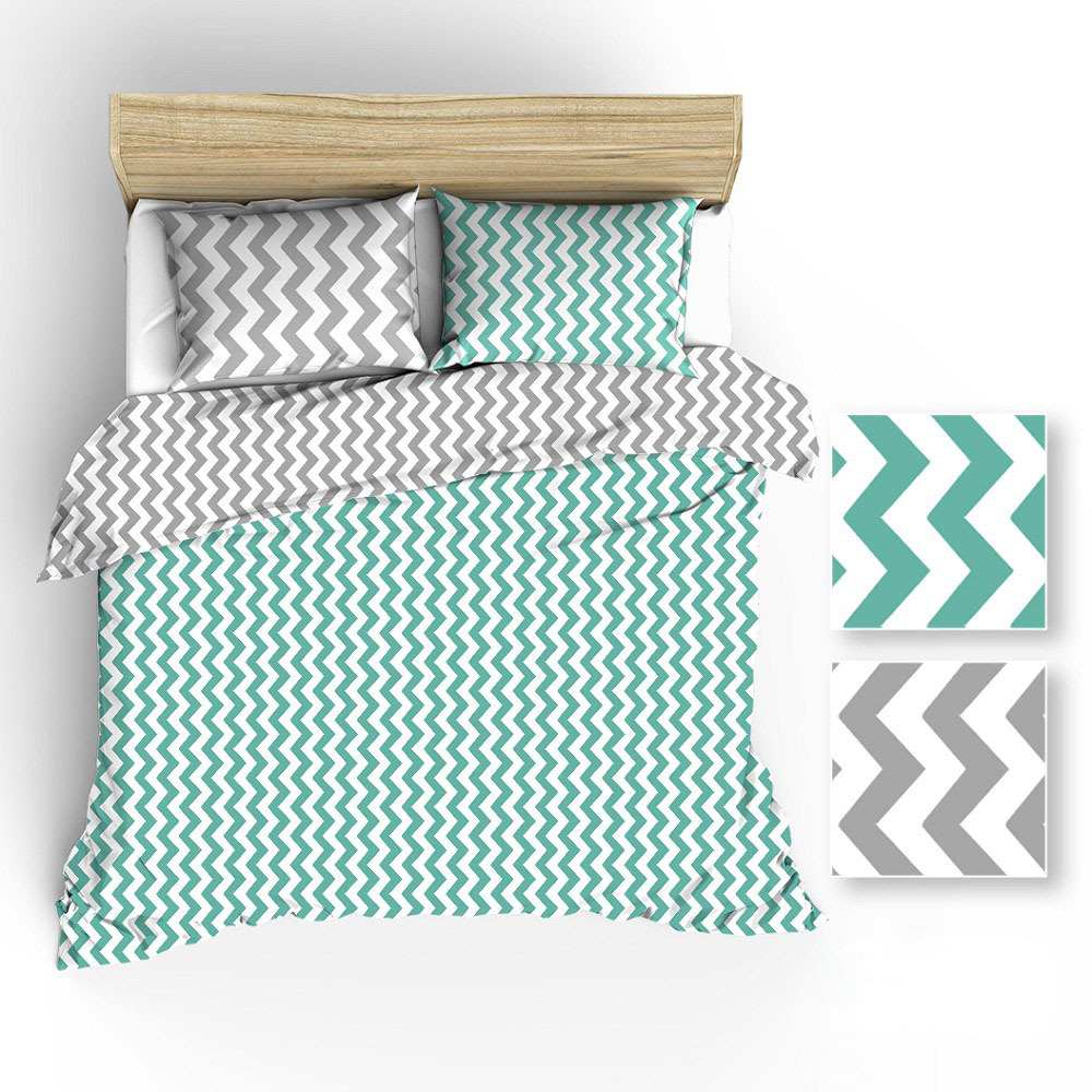 Pościel bawełniana 200×220 R002 – Biała z szarym i miętowym zygzakiem