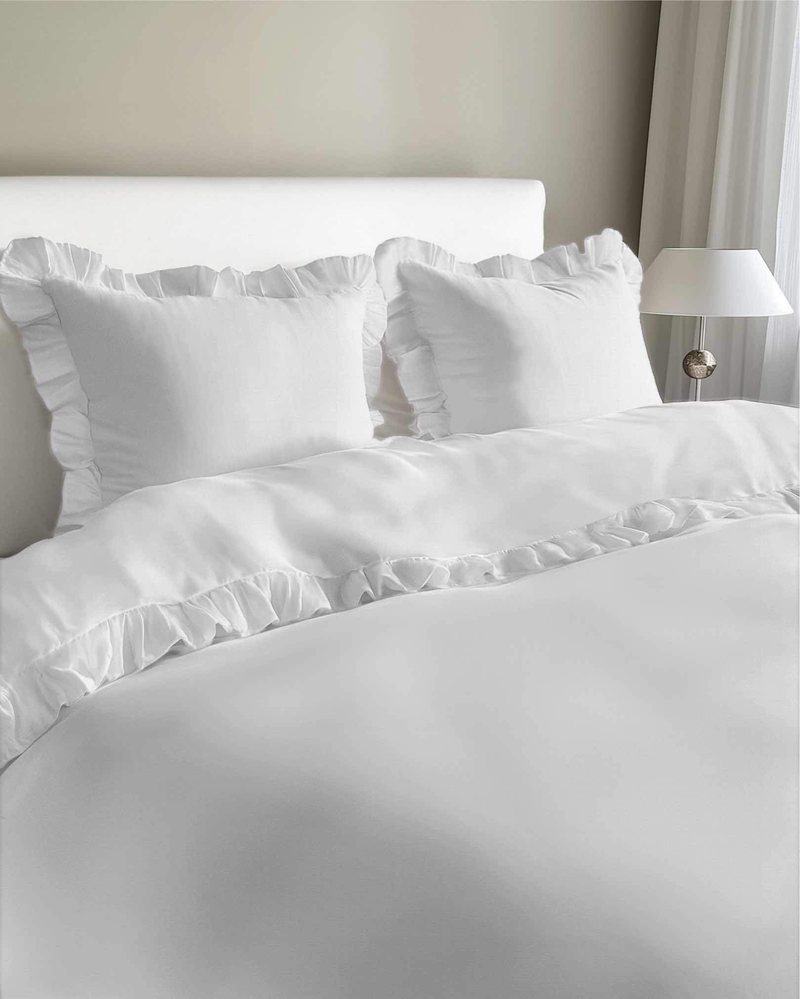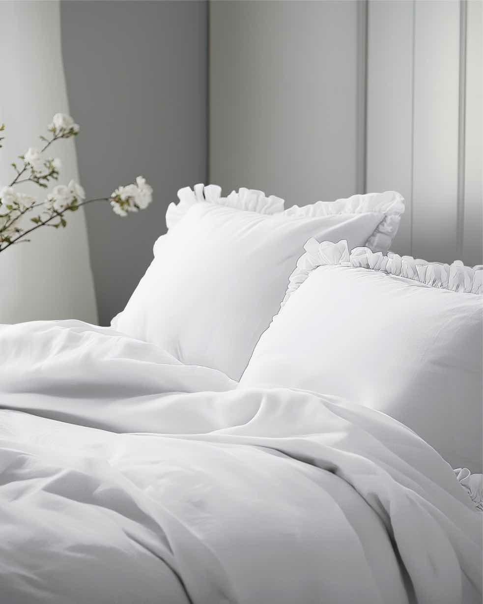 Elegancka, jednobarwna pościel z delikatną falbanką – klasyka i subtelność w jednym.