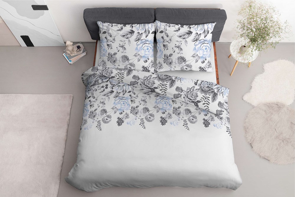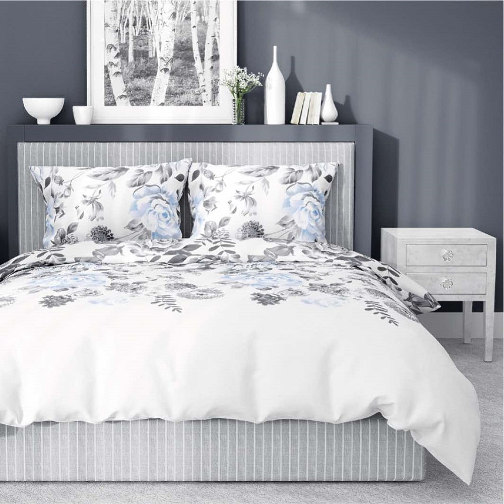 Pościel bawełniana 220×200 biała szara błękitna kwiaty 4462 B bawełna 40