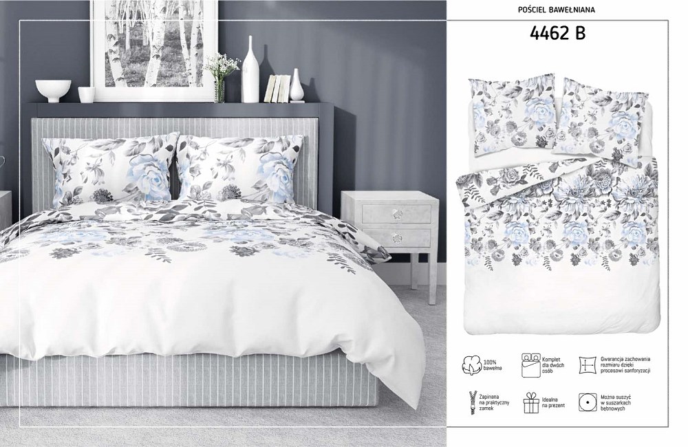 Odkryj naszą wysokiej jakości pościel bawełnianą w rozmiarze 220×200 cm, dostępną w eleganckich kolorach: białym, szarym i błękitnym, zdobioną delikatnym motywem kwiatowym (model 4462 B). Idealna do nowoczesnych i klasycznych wnętrz, łączy w sobie wygodę z estetyką.