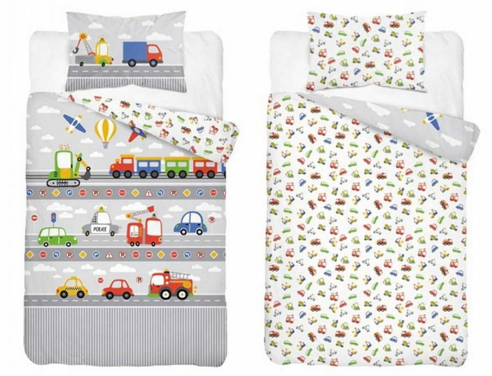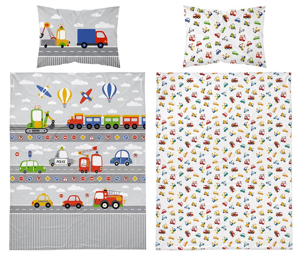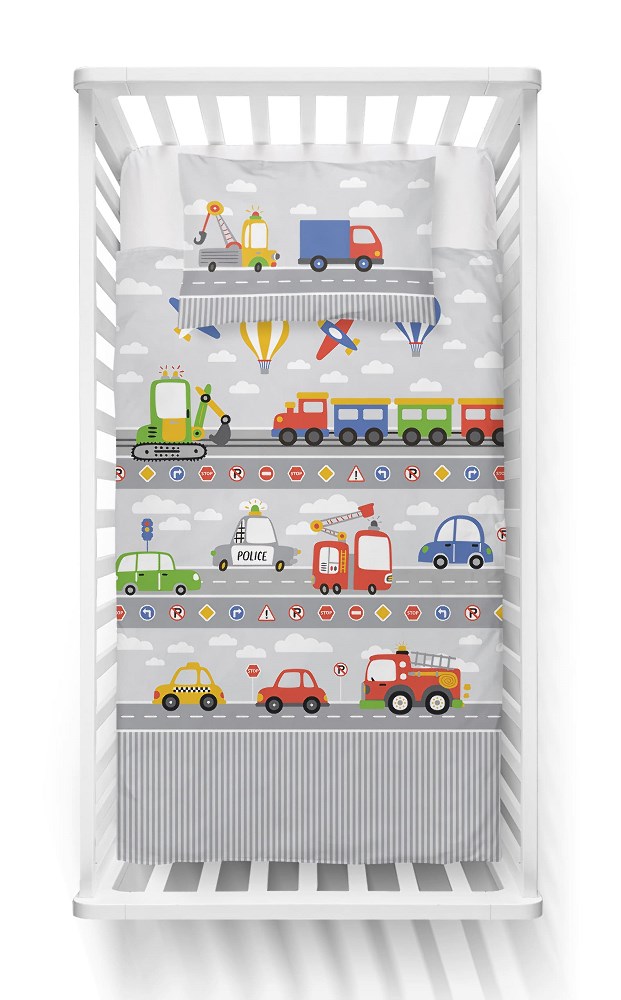 Pościel bawełniana 90×120 Pojazdy Droga szara wielokolorowa dziecięca do łóżeczka jedna poszewka 40×60 Mayamoo 26