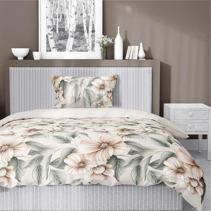 Pościel satynowa 140×200 kremowa zielona bezowa jasna kwiaty liście z jedną poszewką Home Satin 59
