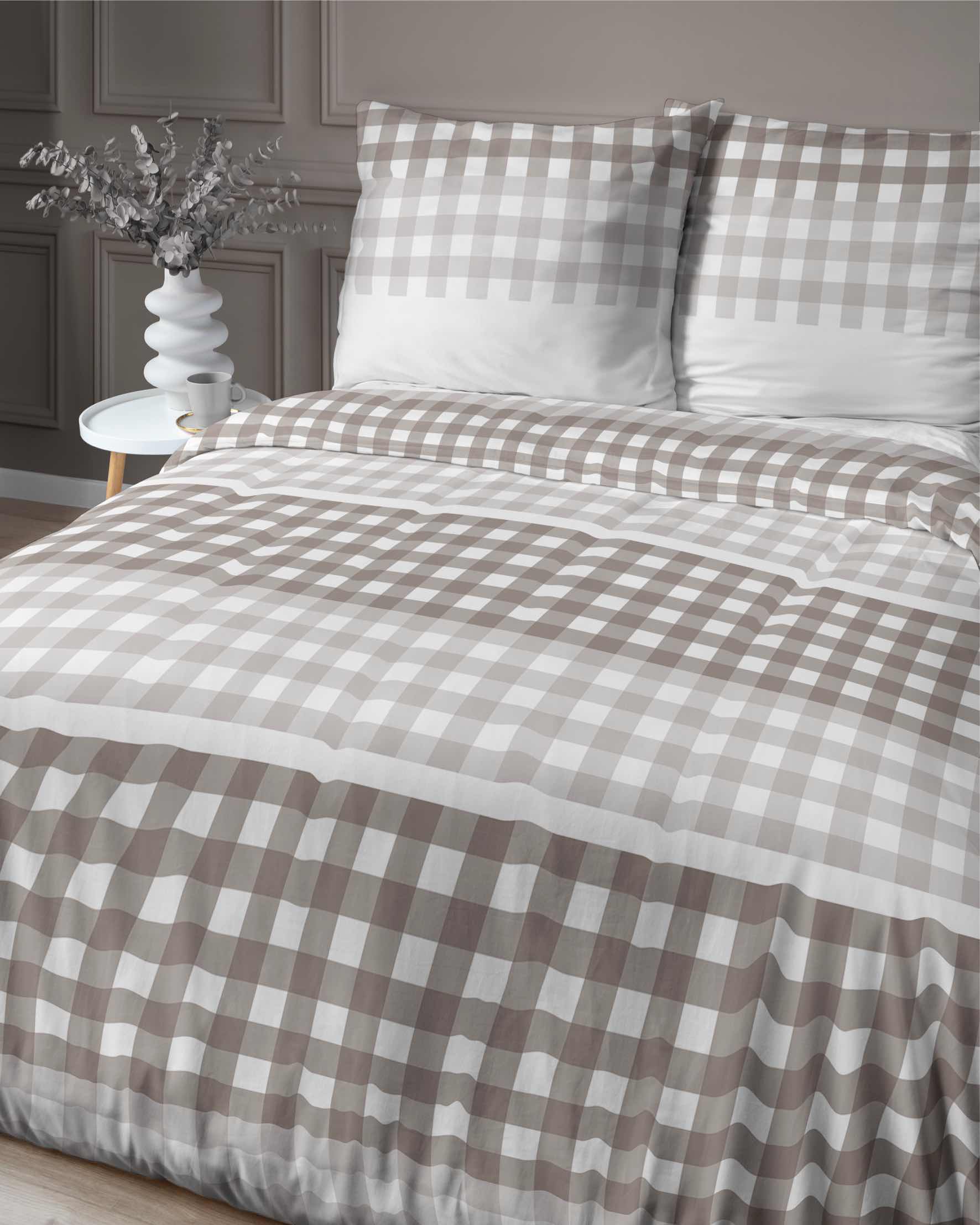 Delikatny, beżowy kolor z klasycznym wzorem w kratkę wprowadza elegancki, ale również ciepły i przytulny klimat do sypialni. Pościel w kratkę pasuje zarówno do nowoczesnych, jak i tradycyjnych wnętrz, idealnie komponując się z różnymi dodatkami.
