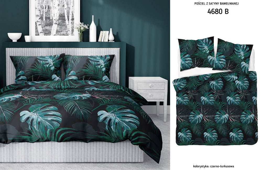 Pościel satynowa 140×200 czarna turkusowa liście 4680 B z jedną poszewką Home Satin 40
