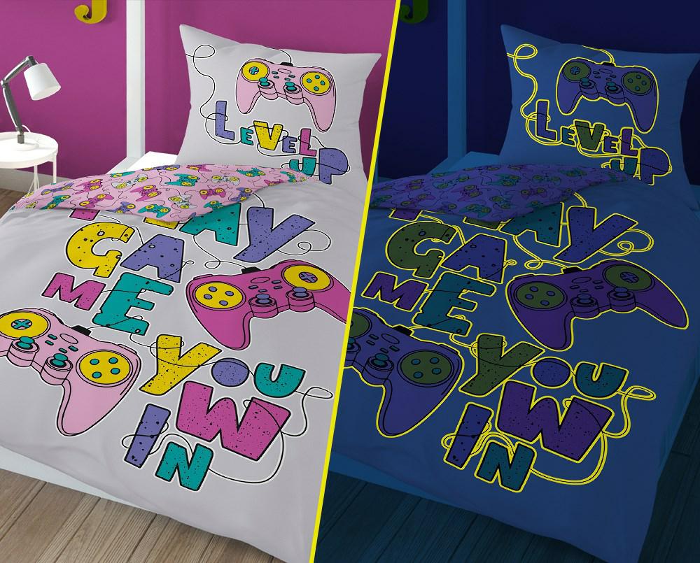Wprowadź do pokoju swojego dziecka nowy poziom stylu i komfortu! Młodzieżowa pościel Game Over 140×200 cm z motywem padów i napisem Level Up to idealny wybór dla każdego fana gier komputerowych. Dzięki specjalnym niciom fluorescencyjnym pościel świeci w ciemności i nie tylko zachwyca wyglądem w dzień, ale także tworzy niesamowity klimat nocą.