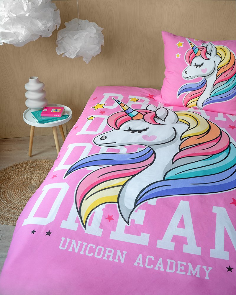 Motyw jednorożca to jeden z najpopularniejszych motywów, który nigdy nie wychodzi z mody. Subtelna różowa kolorystyka, połączona z magicznym motywem, sprawi, że każda noc będzie niezapomniana, a poranek przywita Cię radosnym uśmiechem.