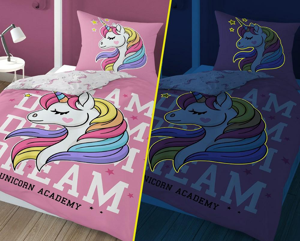 Pościel świecąca w ciemności 140×200 Jednorożec unicorn różowa bawełniana fluorescencyjna