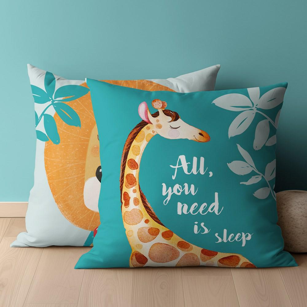 Jedna strona prezentuje zabawny nadruk z napisem „All you need is sleep” oraz sympatycznymi zwierzątkami, druga – stonowana grafika, która wprowadza spokój i harmonię. Dzięki temu możesz dopasować wystrój do nastroju lub pory roku!