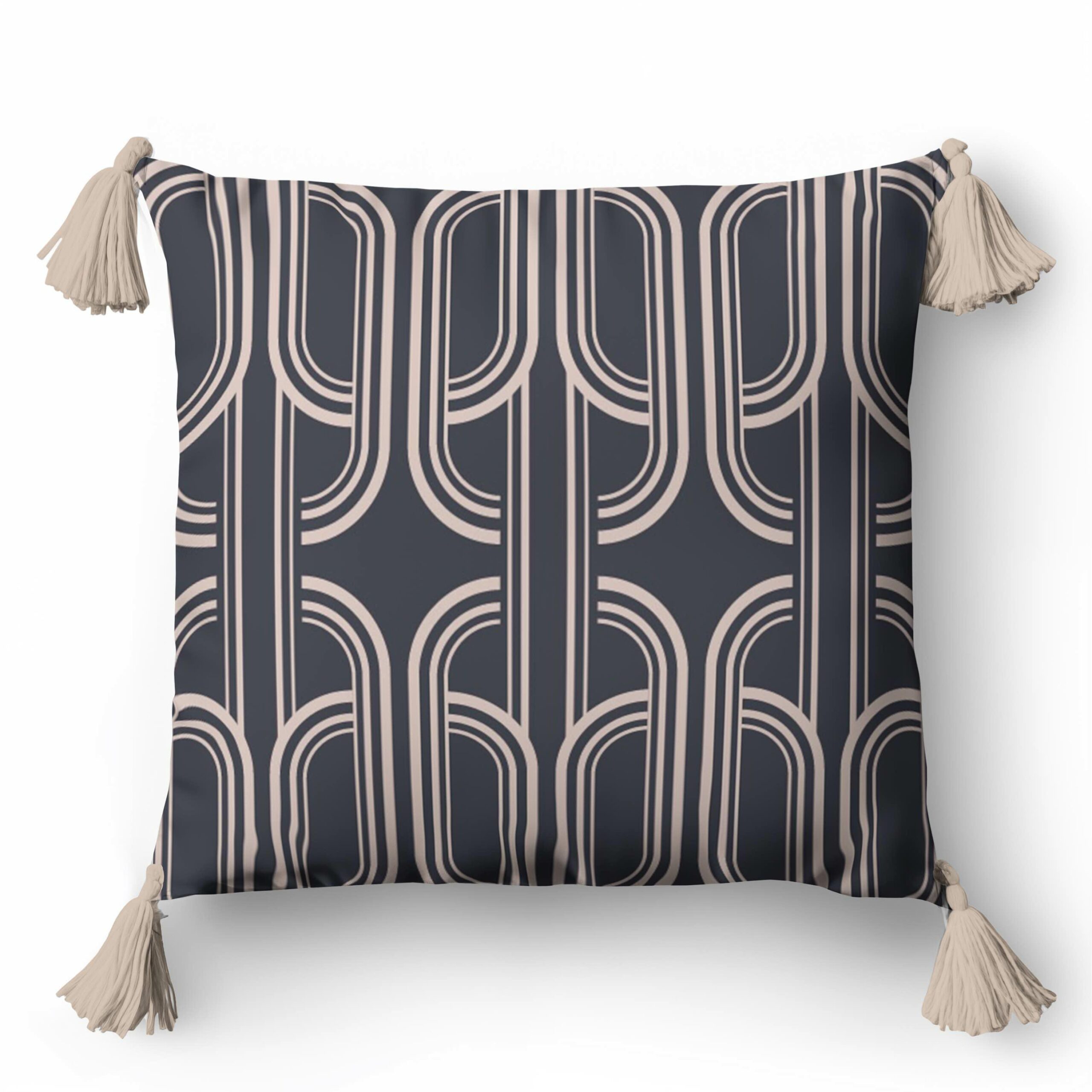 Stylowa poszewka dekoracyjna w geometryczny wzór to nowoczesny akcent do Twojego wnętrza. Subtelne połączenie grafitu, beżu i jasnych tonów doskonale pasuje do eleganckich aranżacji.