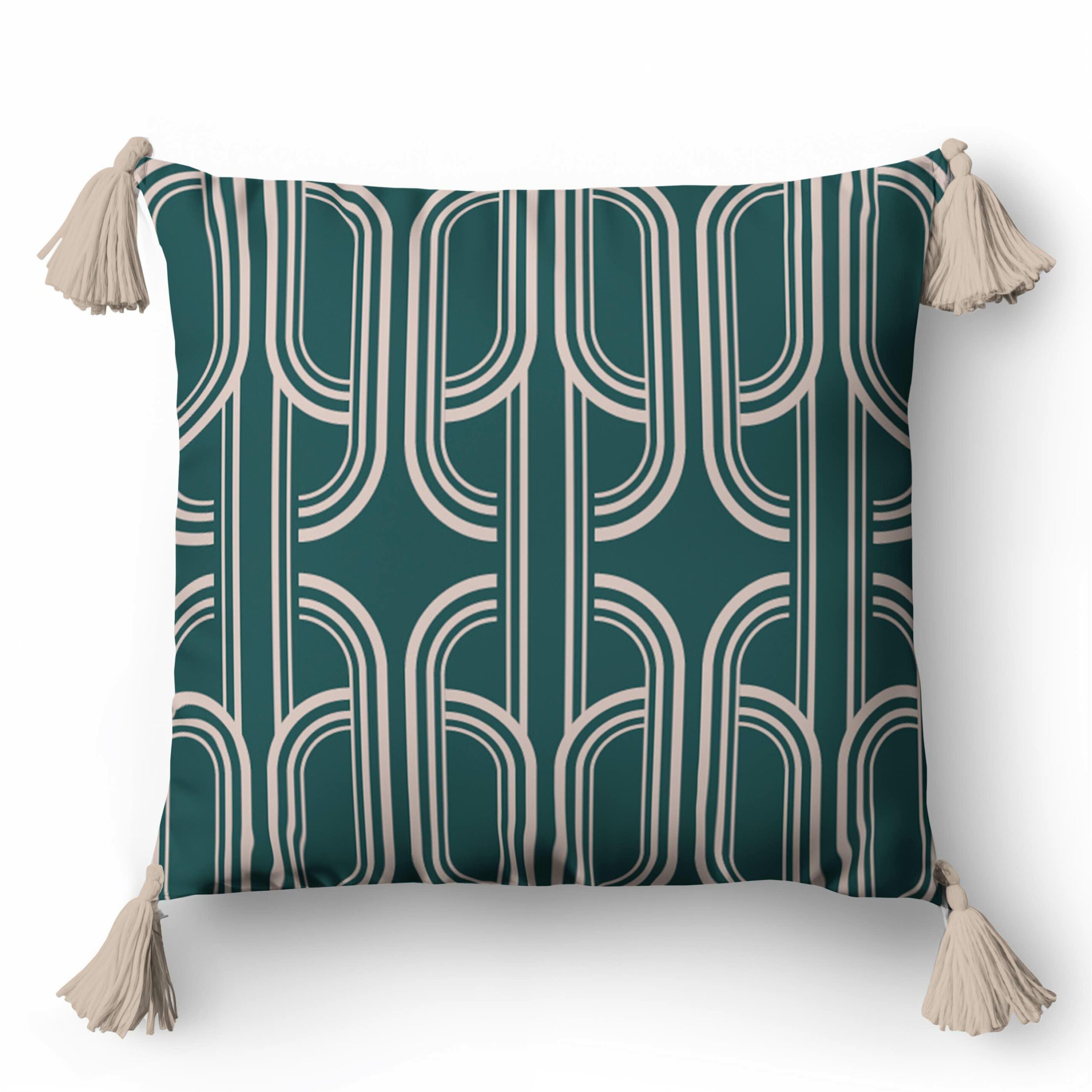 Nowoczesna poszewka dekoracyjna z geometrycznym wzorem w odcieniach butelkowej zieleni i kremu. Idealna do wnętrz inspirowanych naturą i elegancją.