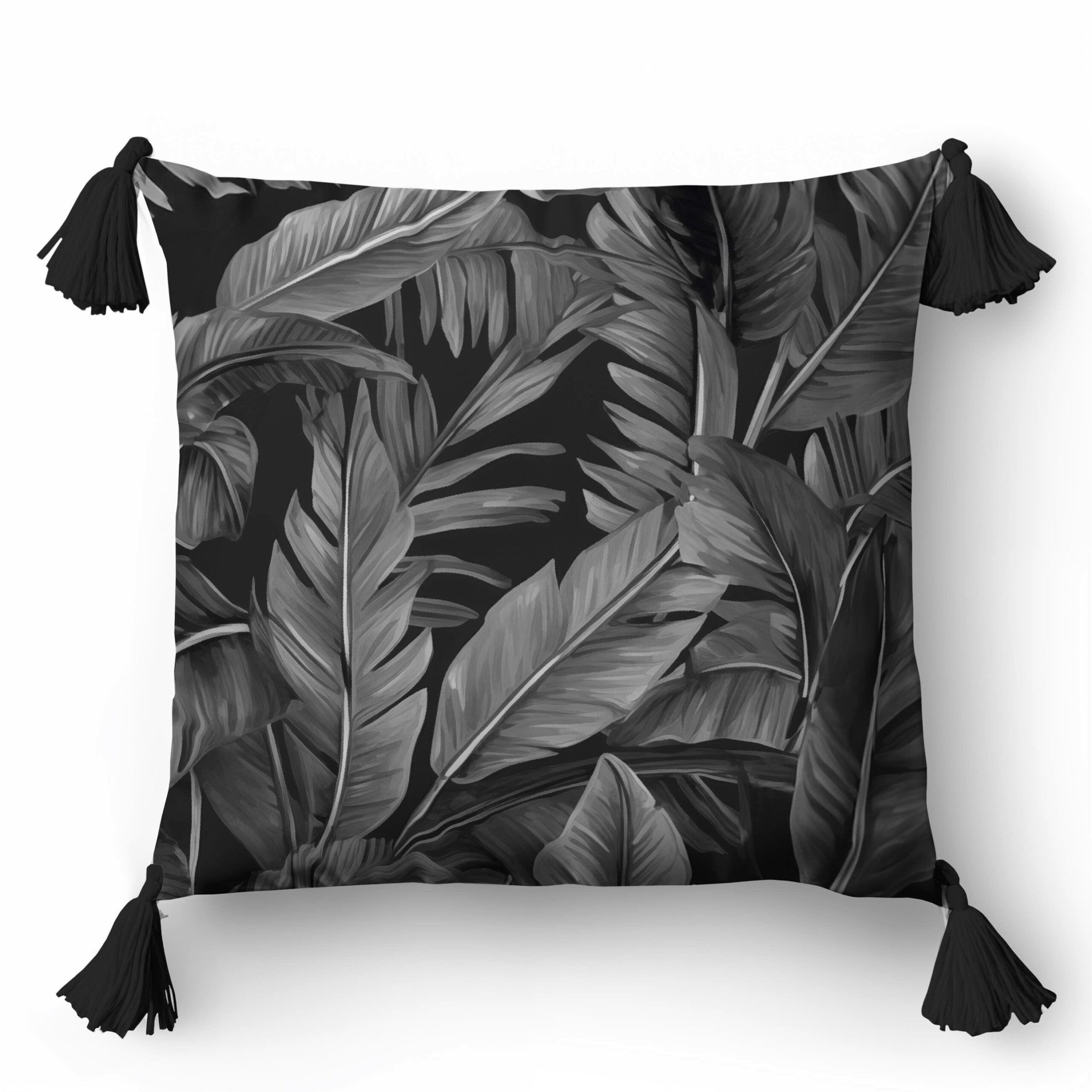 Nowoczesna poszewka dekoracyjna z motywem liści w odcieniach czerni i szarości to idealne rozwiązanie dla eleganckich i minimalistycznych wnętrz.