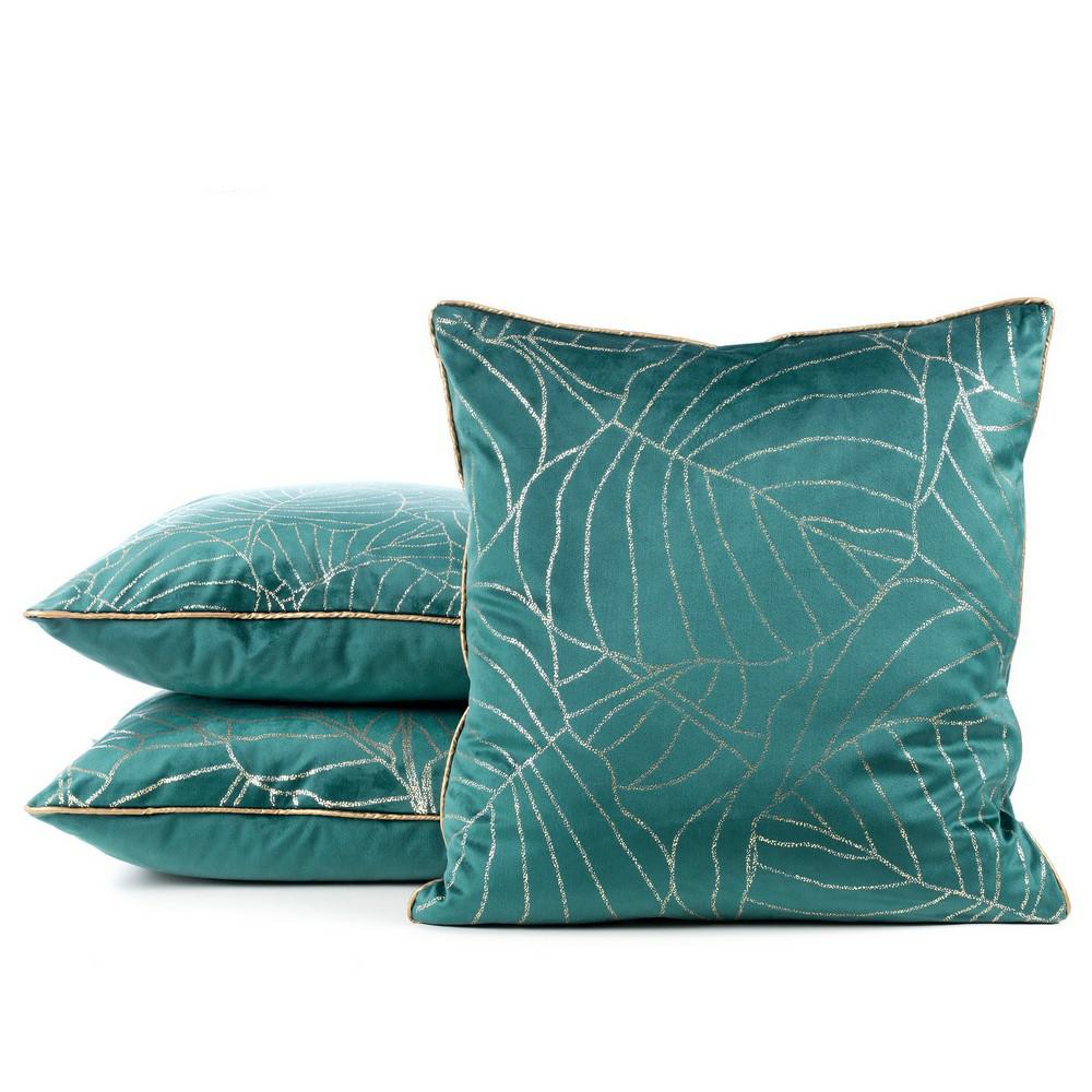 Poszewka dekoracyjna 45×45 Lili 4 turkusowa ze złotym nadrukiem liści welurowa Limited Collection Eurofirany