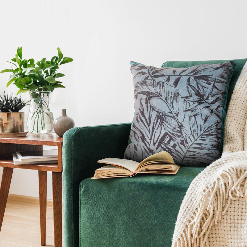 Poszewka dekoracyjna 45×45 Monte popielata zielona z miękkiego weluru z nadrukiem liści Terra Eurofirany