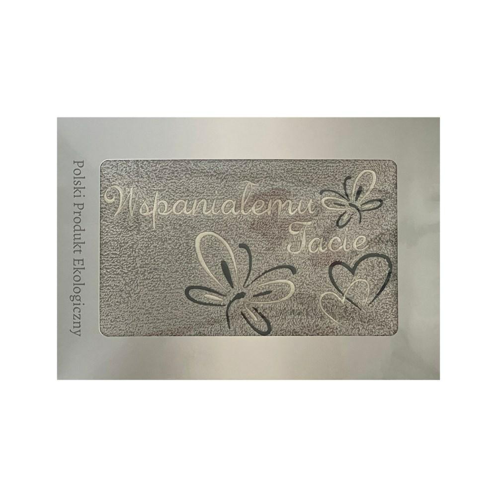 Prezent dla Taty ręcznik 70×140 Wspaniałemu Tacie szary jasny serduszka w pudełku na Dzień Taty motylki