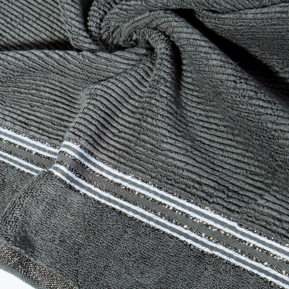 Bardzo puszysty i wyjątkowo chłonny ręcznik z bawełny frotte o strukturze delikatnych prążków. Bordiura w ciemniejszym kolorze z dodatkiem lśniącej nitki. szerokość: 30 cm, długość: 50 cm, kolor: stalowy, Gramatura: 530 GSM, Skład: 100% bawełna; 97,3% baw