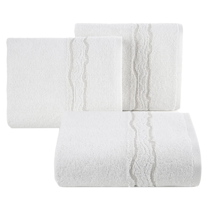 Ręcznik Karin, Kluczowe cechy produktu: Materiał: 100% bawełna, Część ozdobna: 50% poliester, 50% wiskoza, Szerokość: 30 cm, Długość: 50 cm, Gramatura: 500 GSM, Stylowa ozdobna bordiura z błyszczącą nicią.