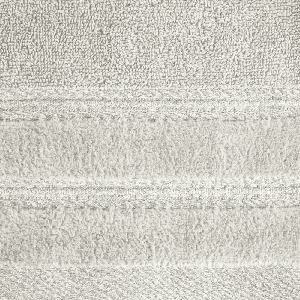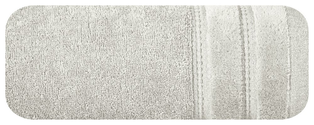 Klasyczny ręcznik kąpielowy z chłonnej tkaniny bawełnianej o splocie frotte. Minimalistyczna bordiura z weluru z dodatkiem lśniącej, metalicznej nici. szerokość: 70 cm, długość: 140 cm, kolor: beżowy, Gramatura: 500 GSM, Skład: 100% bawełna; 99.6% bawełna
