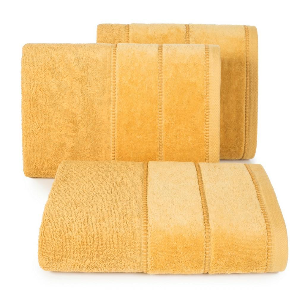 Ręcznik z ozdobną welurową bordiurą w pasy szerokość: 70 cm, długość: 140 cm, kolor: musztardowy, Gramatura: 500 GSM, Skład: 100% bawełna; 60% bawełna 40% poliester