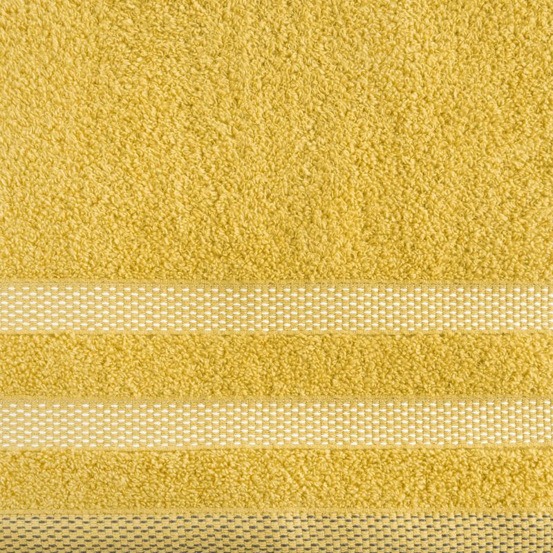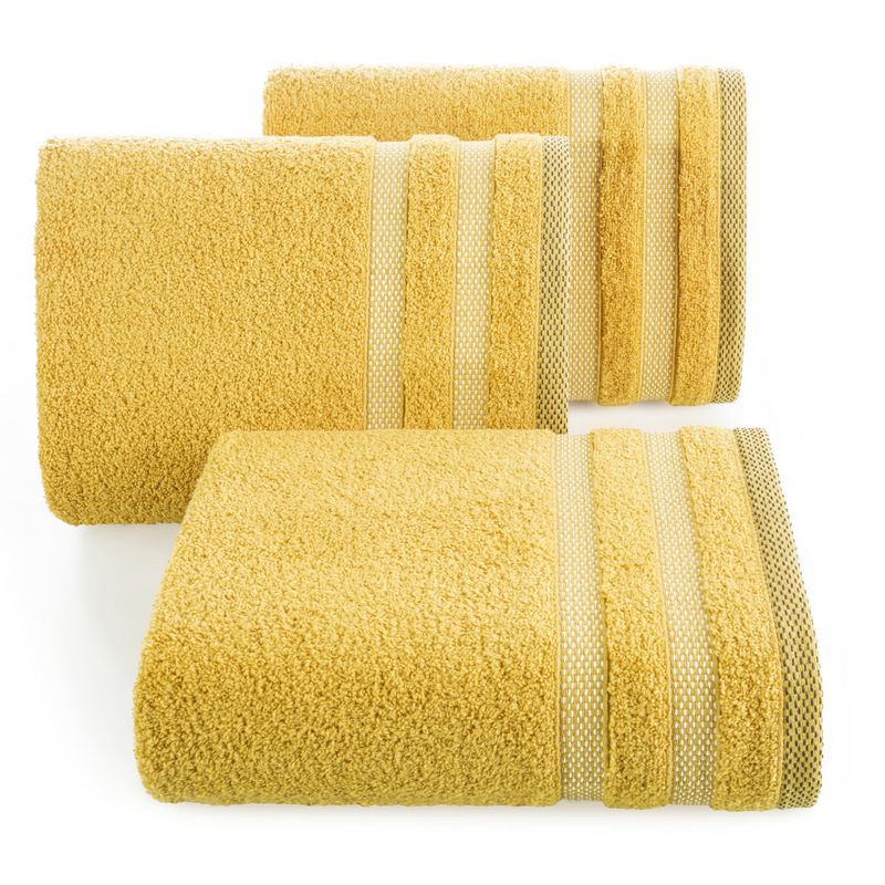 Puszysty i chłonny ręcznik kąpielowy z bawełny frotte o klasycznym charakterze zdobiony elegancką bordiurą w paski z dodatkiem lśniących nici. Łatwy w praniu. szerokość: 30 cm, długość: 50 cm, kolor: musztardowy, Gramatura: 400 GSM, Skład: 100% bawełna; 5