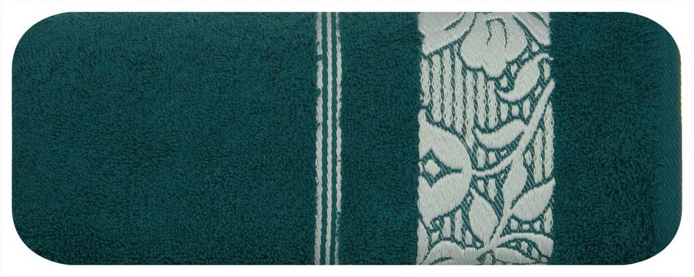 Elegancki ręcznik kąpielowy z miękkiej i chłonnej bawełny frotte zdobiony żakardową bordiurą z kwiatowym wzorem w dopasowanym kolorze. Bardzo miękki i przyjemny szerokość: 50 cm, długość: 90 cm, kolor: turkusowy, Gramatura: 500 GSM, Skład: 100% bawełna; 7
