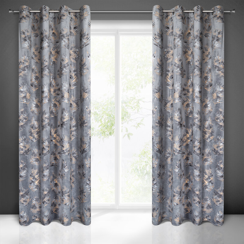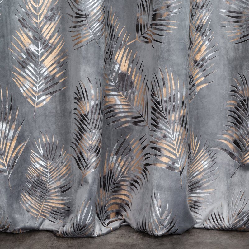 Zasłona 140×250 Gloria stalowa złota liście welurowa gotowa na przelotkach Eurofirany