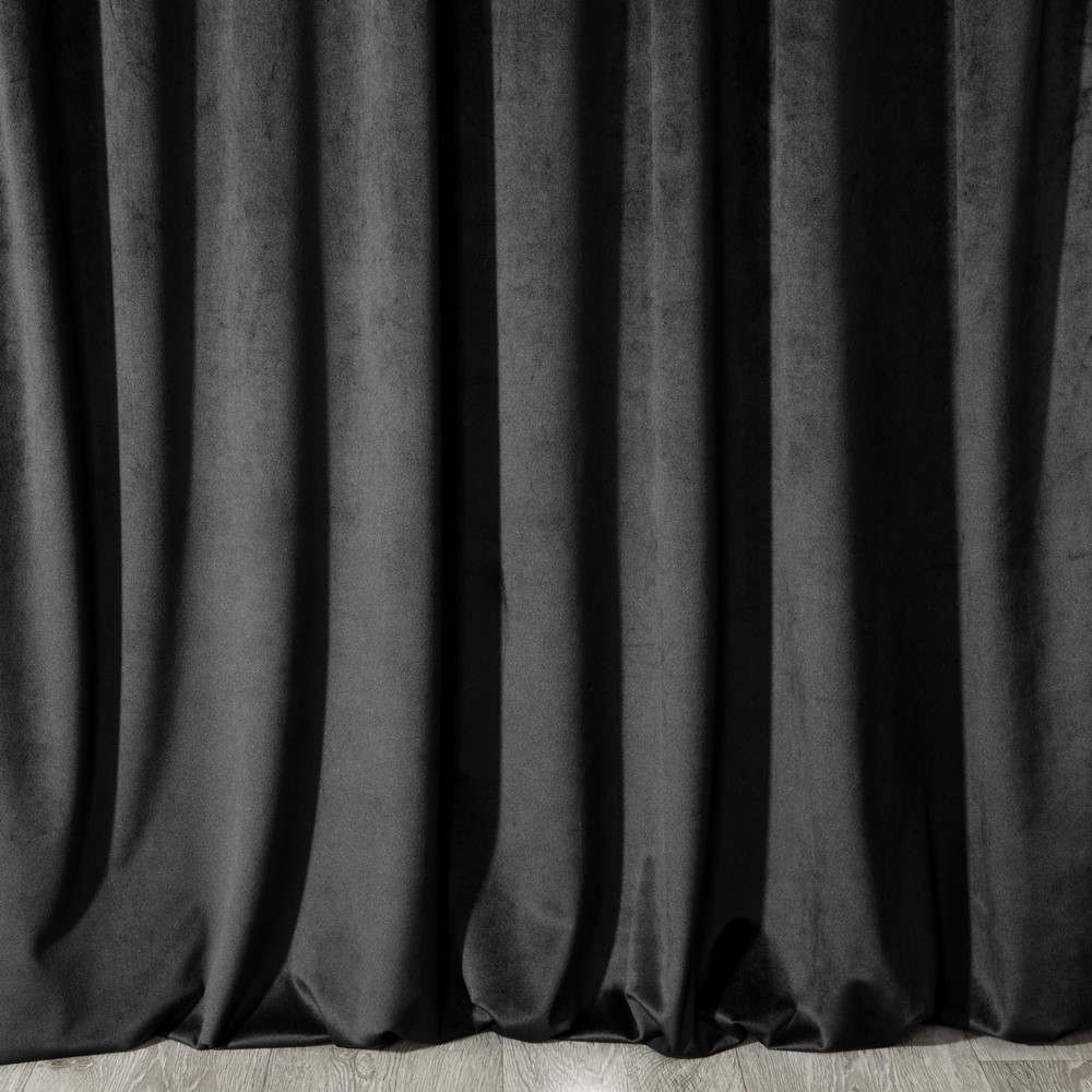 Miękka zasłona z welwetu o matowym wykończeniu. Mięsista tkanina o średnich właściwościach zaciemniających nadaje wnętrzu eleganckiego charakteru. szerokość: 140 cm, długość: 250 cm, kolor: czarny, Gramatura: 200 GSM, Skład: 100% poliester