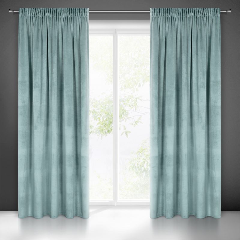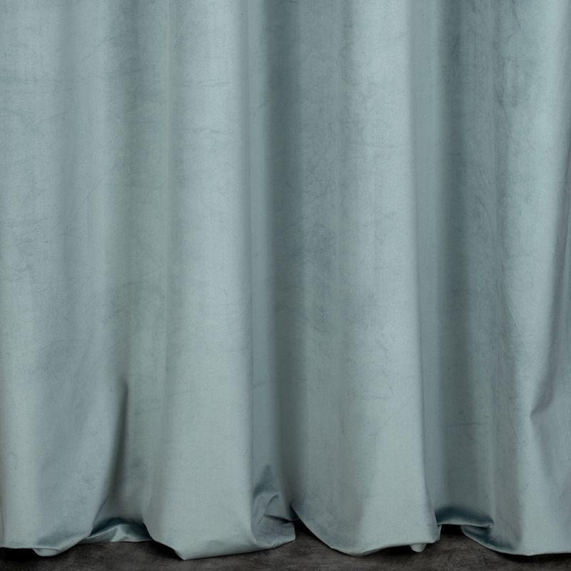Miękka zasłona z welwetu o matowym wykończeniu. Mięsista tkanina o średnich właściwościach zaciemniających nadaje wnętrzu eleganckiego charakteru. szerokość: 140 cm, długość: 270 cm, kolor: szałwiowy, Gramatura: 200 GSM, Skład: 100% poliester