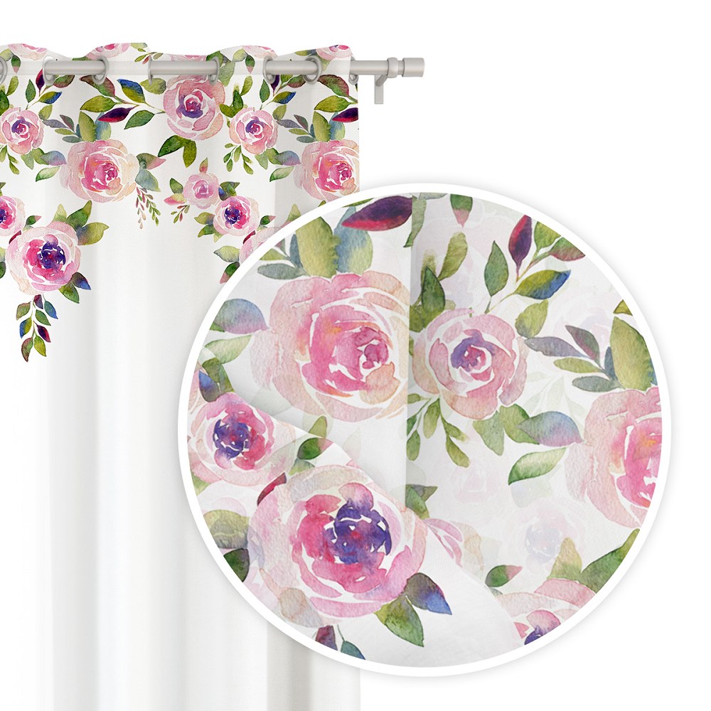 Zasłona gotowa 140×250 Mansion różyczki różowe biała na przelotkach