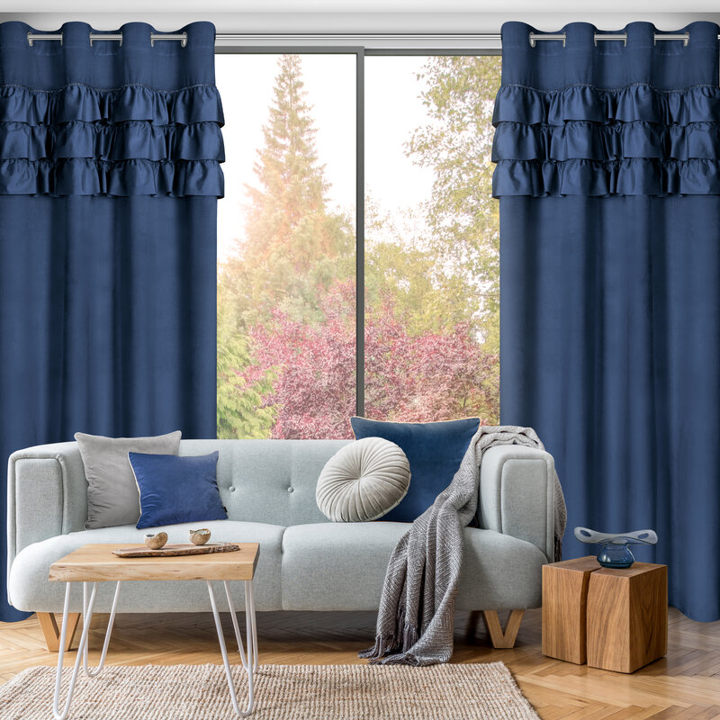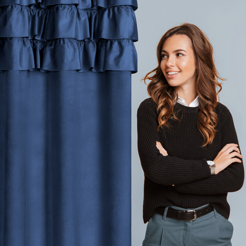 Dodaj elegancji i stylu do swojego wnętrza z zasłoną gotową Sami od renomowanej marki Eurofirany. Wykonana z wysokiej jakości weluru, zasłona zachwyca swoim luksusowym wyglądem oraz wyjątkową miękkością. Granatowy kolor nadaje pomieszczeniu głębi i klasy, a ozdobne falbanki dodają subtelnej finezji.